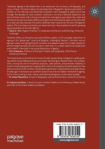 This book is about ageing in Bulgaria. How do Bulgaria's elderly-abandoned by the state and left behind by their adult children and grandchildren-adapt to their continuously shifting environment and a state of perpetual uncertainty? Drawing on dozens of interviews with older people in Bulgaria's capital Sofia as well as a village in the Bulgarian Balkans, Iossifova unravels how the dramatic socio-political transitions of the past eighty years have influenced the lifecourse of older people today. She carefully traces their patterns of everyday life in order to draw out the mechanisms through which older people cope with their meagre pensions, sustain their ailing bodies and make do in their tattered homes. Iossifova argues that 'ageing in place' as a popular paradigm underpinning neoliberal policy agendas has no place in Bulgaria and the wider Global East, where translocal ageing is the norm.