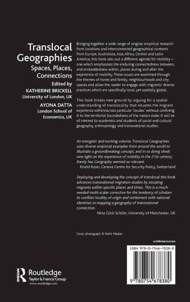 Contents: Part 1 Introduction: Translocal Geographies: Introduction: translocal geographies Katherine Brickell and Ayone Datta. Part 2 Translocal Spaces; Home and Family: Translocal geographies of 'home' in Siem Reap Cambodia Katherine Brickell; Translocal family relations amongst the Lahu in Northern Thailand Brian A.L. Tan and Brenda S.A. Yeoh; British families moving home: translocal geographies of return migration from Singapore Madeleine E. Hatfield. Part 3 Translocal Neighbourhoods: Translocal geographies of London: belonging and 'otherness' among Polish migrants after 2004 Ayona Datta; ' You wouldn't know what's in there would you?' Homeliness and 'foreign' signs in Ashfield Sydney Amanda Wise; Ways out of crisis in Buenos Aires: translocal landscapes and the activation of mobile resources Ryan Centner. Part 4 Urban Translocalities: Spaces Places Connections: Fear of small distances: home associations in Douala Dar es Salaam and London Ben Page; Translocal spatial; geographies: multi-sited encounters of Greek migrants in Athens Berlin and New York Anastasia Christou; Translocality in Washington DC and Addis Ababa: spaces and linkages of the Ethiopian diaspora in two capital cities Elizabeth Chacko. Part 5 Epilogue: Translocality; a critical reflection Michael Peter Smith; Bibliography; Index.