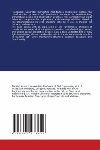 "Translucent Concrete: Illuminating Architectural Innovation" explores the transformative potential of translucent concrete in revolutionizing architectural design and construction practices. This comprehensive guide delves into the properties, applications, and creative possibilities offered by this groundbreaking material, shedding light on its role in shaping the future of architecture.The book begins with an exploration of the fundamental principles of translucent concrete, elucidating its composition, manufacturing processes, and unique optical properties. Readers gain a deep understanding of how light-transmitting elements embedded within the concrete matrix enable it to transmit light while maintaining structural integrity, durability, and functionality.