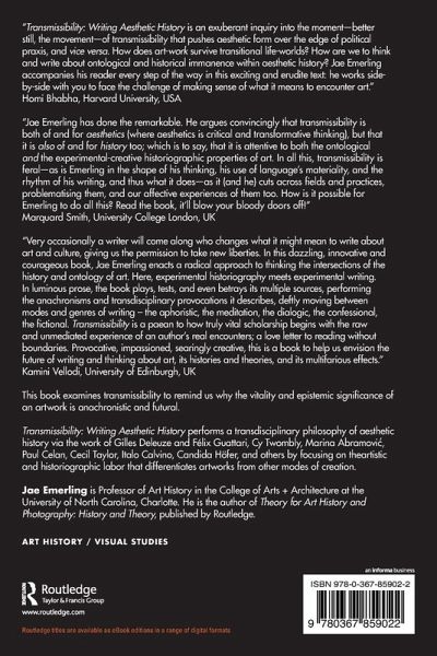 Very occasionally a writer will come along who changes what it might mean to write about art and culture, giving us the permission to take new liberties. In this dazzling, innovative and courageous book, Jae Emerling enacts a radical approach to thinking the intersections of the history and ontology of art. Proposing the concept of 'transmissibility' for an 'aesthetic history' that complicates the history of art and the history of aesthetics, he demonstrates a new way of thinking artworks as ontological-historiographical configurations, or 'sense-events'. Rather than the presentation of a new discourse or manifesto, Emerling offers transmissibility as a concept kept in tension, refracted through aesthetic figures and conceptual personae, and continually recreated within the experience of creative acts. Here, experimental historiography meets experimental writing. Crossing an astonishing breadth of references and interlocutors across philosophy, the history of art, literature and critical theory, visual and material culture, Emerling inspires the field by which we think with art. In luminous prose, the book plays, tests, and even betrays its multiple sources, performing the anachronisms and transdisciplinary provocations it describes, deftly moving between modes and genres of writing - the aphoristic, the meditation, the dialogic, the confessional, the fictional - whilst keeping us within the singular thickness of ideas. What must writing do to affirm the becoming of art? How can we extract the virtual from the historical? Emerling addresses such issues as memory, time, destruction, imagination, love and failure whilst drawing us into the folds and intimacies of his thought, and the ceaseless ebbs and flows of an intellectual journey. Transmissibility is a paean to how truly vital scholarship begins with the raw and unmediated experience of an author's real encounters; a love letter to reading without boundaries. Provocative, impassioned, searingly creative, this a book to help us envision the future of writing and thinking about art, its histories and theories, and its multifarious effects.