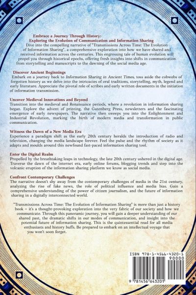 Embrace a Journey Through History: Exploring the Evolution of Communication and Information Sharing Dive into the compelling narrative of "Transmissions Across Time: The Evolution of Information Sharing", a comprehensive exploration into how we have shared and received information across the centuries. This engrossing tale of human evolution will propel you through historical epochs, offering fresh insights into shifts in communication from storytelling and manuscripts to the dawning of the social media age. Discover Ancient Beginnings Embark on a journey back to Information Sharing in Ancient Times, toss aside the cobwebs of forgotten history as we delve into the intricacies of oral traditions, storytelling, myth, legend and early literature. Appreciate the pivotal role of scribes and early written documents in the initiation of information transmission. Uncover Medieval Innovations and Beyond Transition into the medieval and Renaissance periods, where a revolution in information sharing began. Explore the advent of printing, the Gutenberg Press, newsletters and the fascinating emergence of early newspapers. The narrative then sweeps you into the Enlightenment and Industrial Revolution, marking the birth of modern media and transformation in public communication. Witness the Dawn of a New Media Era Experience a paradigm shift as the early 20th century heralds the introduction of radio and television, changing the media landscape forever. Feel the pulse and the rhythm of society as it adapts and moulds around this newfound fast-paced information sharing tool. Enter the Digital Realm Propelled by the breathtaking leaps in technology, the late 20th century ushered in the digital age. Traverse the dawn of the internet era, early online forums, blogging trends and step into the volcanic eruption of the information sharing platform we know as social media. Confront Contemporary Challenges The narrative doesn't shy away from the contemporary challenges of media in the 21st century, analyzing the rise of fake news, the role of political influence and media bias. Gain a comprehensive understanding of the power of citizen journalism, and the future of information sharing in a digitally interconnected world. "Transmissions Across Time: The Evolution of Information Sharing" is more than just a history book - it's a thought-provoking exploration into the very fabric of our society and how we communicate. Through this panoramic journey, you will gain a deeper understanding of our shared past, the dramatic shifts in our modes of communication, and insight into the potential future of information sharing. This is the quintessential read for all media enthusiasts and history buffs. Be prepared to embark on an intellectual voyage that you won't soon forget.