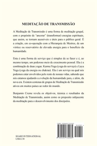 A Meditação de Transmissão é uma forma de meditação grupal, com o propósito de "ancorar" (transformar) energias espirituais, que assim, se tornam acessíveis e úteis para o público geral. É a criação, em co-operação com a Hierarquia de Mestres, de um vórtice ou reservatório de elevada energia para o benefício da humanidade. Esta é uma forma de serviço que é simples de se fazer e é, ao mesmo tempo, um poderoso meio de crescimento pessoal. Ela é a combinação de duas yogas: Karma Yoga (yoga do serviço) e Laya Yoga (yoga da energia ou chakras). Ela é um serviço na qual nós podemos estar envolvidos pelo resto de nossas vidas, sabendo que nós estamos ajudando a evolução da humanidade para, e além, da nova era. Existem centenas de grupos de Meditação de Transmissão ativos em muitos países ao redor do mundo. Benjamin Creme revela os objetivos, técnica e resultados da Meditação de Transmissão, assim como os proposito subjacente da meditação para o desenvolvimento dos discípulos.