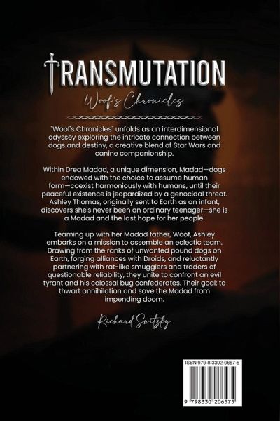 "Woof's Chronicles" unfolds as an interdimensional odyssey, exploring the intricate connection between dogs and destiny, a creative blend of Star Wars and canine companionship. Within Drea Madad, a unique dimension, Madad-dogs endowed with the choice to assume human form- coexist harmoniously with humans, until their peaceful existence is jeopardized by a genocidal threat. Ashley Thomas, originally sent to Earth as an infant, discover she's never been an ordinary teenager - she is a Madad and the last hope for her people. Teaming up with her Madad father, Woof, Ashley embarks on a mission to assemble an eclectic team. Drawing form the ranks of unwanted pound dogs on Earth, forging alliances with Droids, and reluctantly partnering with rat-like smugglers and traders of questionable reliability, they unite to confront an evil tyrant and his colossal bug confederates. Ther goal: to thwart annihilation and save the Madad from impending doom.