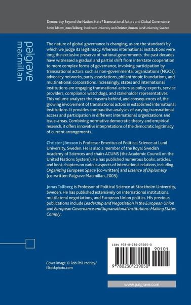 List of Figures and Tables Preface Notes on the Contributors Transnational Actor Participation in International Institutions: Where, Why, and with What Consequences?; J.Tallberg & C.Jönsson Capturing the Transnational; C.Jönsson Transnational Access to International Institutions: Three Approaches; J.Tallberg Explaining Patterns of Transnational Participation: The Role of Policy Fields; J.Steffek Explaining Varying Degrees of Openness in the Food and Agriculture Organization of the United Nations (FAO); A.Liese WTO and the Environmental Movement: On the Path to Participatory Governance?; Å.Casula Vifell Limits to Transnational Participation: The Global Governance of Migration; S.Kalm Private Authority on the Rise: A Century of Delegation in Multilateral Environmental Treaties; J.F.Green Does Global Democracy Matter? Hypotheses on Famine and War; H.Agné Democracy Counts: Problems of Equality in Global Democracy; S.Näsström Beyond Democratic Legitimacy: Global Governance and the Promotion of Liberty; J.Bartelson Transnational Access: Findings and Future Research; C.Jönsson & J.Tallberg Index