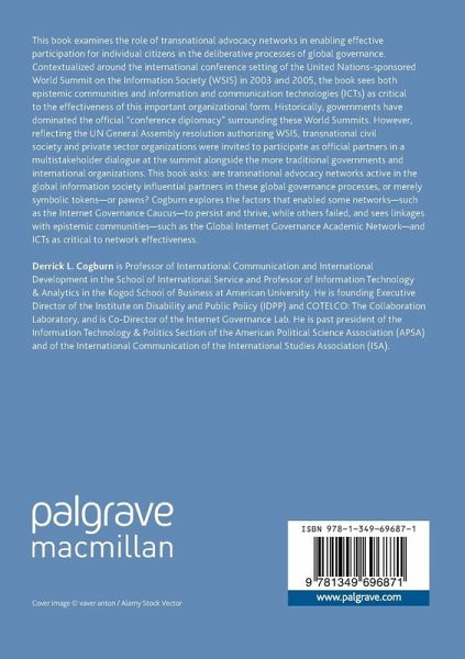This book examines the role of transnational advocacy networks in enabling effective participation for individual citizens in the deliberative processes of global governance. Contextualized around the international conference setting of the United Nations-sponsored World Summit on the Information Society (WSIS) in 2003 and 2005, the book sees epistemic communities and information and communication technologies (ICTs) as critical to the effectiveness of this important organizational form. Historically, governments have dominated the official "conference diplomacy" surrounding these World Summits. However, reflecting the UN General Assembly resolution authorizing WSIS, transnational civil society and private sector organizations were invited to participate as official partners in a multistakeholder dialogue at the summit alongside the more traditional governments and international organizations. This book asks: are transnational advocacy networks active in the global information societyinfluential partners in these global governance processes, or merely symbolic tokens-or pawns? Cogburn explores the factors that enabled some networks-such as the Internet Governance Caucus-to persist and thrive, while others failed, and sees linkages with epistemic communities-such as the Global Internet Governance Academic Network-and ICTs as critical to network effectiveness.