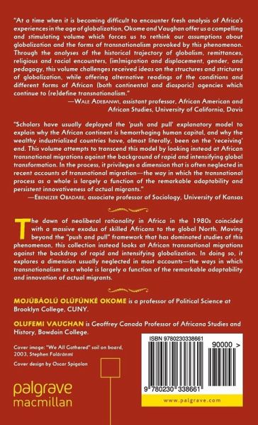 'At a time when it is becoming difficult to encounter fresh analysis of Africa's experiences in the age of globalization, Okome and Vaughan offer us a compelling and stimulating volume which forces us to rethink our assumptions about globalization and the forms of transnationalism provoked by this phenomenon. Through the analyses of the historical trajectory of globalism, remittances, religious and racial encounters, (im)migration and displacement, gender, and pedagogy, this volume challenges received ideas on the structures and strictures of globalization, while offering alternative readings of the conditions and different forms of African (both continental and diasporic) agencies which continue to (re)define transnationalism.' Wale Adebanwi, assistant professor, African American and African Studies, University of California-Davis