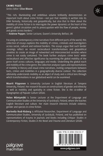 Chapter 1: From Mobile Crimes to Crimes of Mobility, Maarit Piipponen, Helen Mäntymäki and Marinella Rodi-Risberg.- Chapter 2: Transnational Crime in Deon Meyer's Devil's Peak and Santiago Gamboa's Night Prayers, Sam Naidu.- Chapter 3: Temporal, (Trans)national and Human Mobility in María Inés Krimer's Kosher Trilogy, Carolina Miranda.- Chapter 4: Abdelilah Hamdouchi's Whitefly: Transnational Crime, Globalisation and the Arabic Police Procedural, Colette Guldimann.- Chapter 5: Systemic Violence in the Borderlands: Anthony J. Quinn's Border Angels and Alicia Gaspar de Alba's Desert Blood, Eoin D. McCarney.- Chapter 6: Transnational Female Sex Trafficking in Naia Marie Aidt's "Women in Copenhagen," Matt Johnson's Deadly Game, and Stuart Neville's Stolen Souls, Charlotte Beyer.- Chapter 7: The Socially Mobile Female in Victorian and Neo-Victorian Mysteries, Meghan P. Nolan.- Chapter 8: Liminal Spaces in Laurie R. King's Touchstone and Keeping Watch, Mary Ann Gillies.- Chapter 9: Urban Mobility and Technology in Carlo Lucarelli's Almost Blue,Barbara Pezzotti.- Chapter 10: Crime and Detection in a Virtually Mobile World: Tom Hillenbrand's Drohnenland, Heike Henderson.- Chapter 11: Criminal/Liminal/Seminal: Nordic Border Crossings and Crossers in Contemporary Geopolitical Television, Robert A. Saunders.- Chapter 12: Across National, Cultural and Ethnic Borders: The Detectives in Olivier Truc's Reindeer Police Series, Andrea Hynynen.- Chapter 13: Splatter Horror Crime: Crossing Medial Borders in Jo Nesbø's The Snowman, Niklas Salmose.- Chapter 14: Affective Estrangement and Ecological Destruction in TV Crime Series Fortitude, Aino-Kaisa Koistinen and Helen Mäntymäki.- Chapter 15: Sophie Hannah's Hurting Distance as CrimeTrauma Fiction, Marinella Rodi-Risberg.