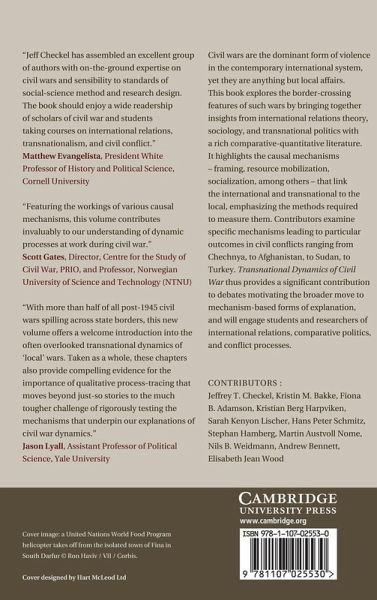 Civil wars are the dominant form of violence in the contemporary international system, yet they are anything but local affairs. This book explores the border-crossing features of such wars by bringing together insights from international relations theory, sociology, and transnational politics with a rich comparative-quantitative literature. It highlights the causal mechanisms - framing, resource mobilization, socialization, among others - that link the international and transnational to the local, emphasizing the methods required to measure them. Contributors examine specific mechanisms leading to particular outcomes in civil conflicts ranging from Chechnya, to Afghanistan, to Sudan, to Turkey. Transnational Dynamics of Civil War thus provides a significant contribution to debates motivating the broader move to mechanism-based forms of explanation, and will engage students and researchers of international relations, comparative politics, and conflict processes.