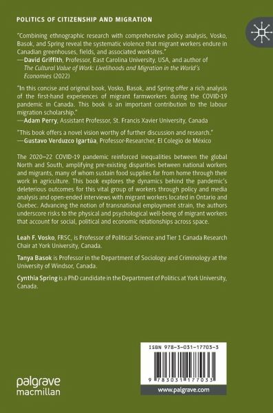 This book explores the dynamics behind the pandemic's deleterious outcomes for this vital group of workers, highlighting migrant farmworkers importance to the Canadian economy, society, and the world of work alongside the conditions they endured before and during the global health pandemic through policy and media analysis and open-ended interviews with workers enrolled in two streams of Canada's Temporary Foreign Worker Program (TFWP) as well as migrants without legal status employed in agriculture located in Ontario and Quebec. Advancing the notion of transnational employment strain, the authors derive insight from the employment strain model, a framework for understanding risks to the physical and psychological well-being of workers, and expand it to account for migrants' relationships across transnational space.