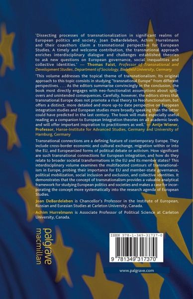"Dissecting processes of transnationalization in significant realms of European politics and society, Joan DeBardeleben, Achim Hurrelmann and their co-authors claim a transnational perspective for European Studies.A timely and welcome contribution, the transnational approach enriches interdisciplinary dialogue and challenges established theories to ask new questions on European governance, social inequalities and collective identities."