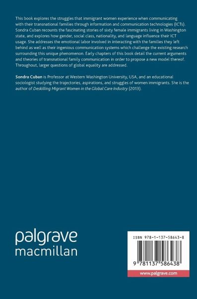 This book explores the struggles that immigrant women experience when communicating with their transnational families through information and communication technologies (ICTs). Sondra Cuban recounts the fascinating stories of sixty female immigrants living in Washington state, and explores how gender, social class, nationality, and language influence their ICT usage. She addresses the emotional labor involved in interacting with the families they left behind as well as their ingenious communication systems which challenge the existing research surrounding this unique phenomenon. Early chapters of this book detail the current arguments and theories of transnational family communication in order to propose a new model thereof. Throughout, larger questions of global equality are addressed.