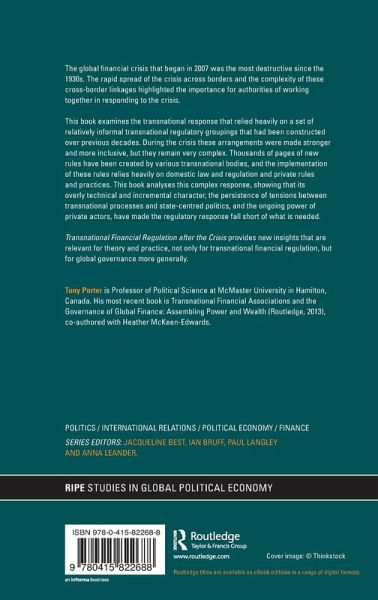 The global financial crisis that began in 2007 was the most destructive since the 1930s. The rapid spread of the crisis across borders and the complexity of these cross-border linkages highlighted the importance for authorities of working together in responding to the crisis. This book examines the transnational response that relied heavily on a set of relatively informal transnational regulatory groupings that had been constructed over previous decades. During the crisis these arrangements were made stronger and more inclusive, but they remain very complex. Thousands of pages of new rules have been created by various transnational bodies, and the implementation of these rules relies heavily on domestic law and regulation and private rules and practices. This book analyses this complex response, showing that its overly technical and incremental character, the persistence of tensions between transnational processes and state-centred politics, and the ongoing power of private actors, have made the regulatory response fall short of what is needed. Transnational Financial Regulation after the Crisis provides new insights that are relevant for theory and practice, not only for transnational financial regulation, but for global governance more generally.