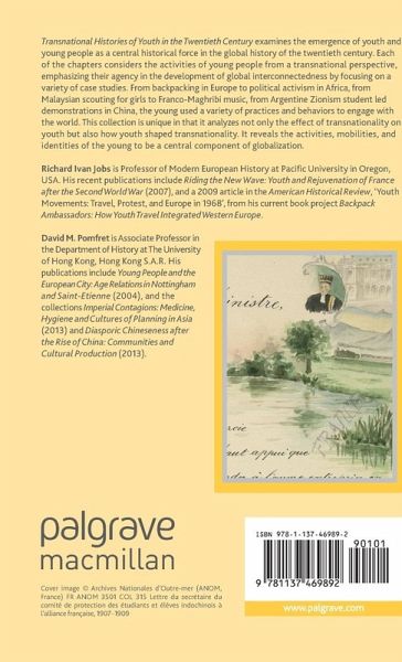 Richard Ivan Jobs is Professor of Modern European History at Pacific University in Oregon, USA. His recent publications include Riding the New Wave: Youth and Rejuvenation of France after the Second World War (2007), and a 2009 article in the American Historical Review, 'Youth Movements: Travel, Protest, and Europe in 1968', from his current book project Backpack Ambassadors: How Youth Travel Integrated Western Europe. David M. Pomfret is Associate Professor in the Department of History at the University of Hong Kong, China. His publications include Young People and the European City: Age Relations in Nottingham and Saint-Etienne (2004), and the collections Imperial Contagions: Medicine, Hygiene and Cultures of Planning in Asia (2013) and Diasporic Chineseness after the Rise of China: Communities and Cultural Production (2013).