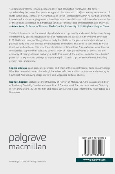 This book broadens the frameworks by which horror is generally addressed. Rather than being constrained by psychoanalytical models of repression and castration, the volume embraces M.M. Bakhtin's theory of the grotesque body. For Bakhtin, the grotesque body is always a political body, one that exceeds the boundaries and borders that seek to contain it, to make it behave and conform. This vital theoretical intervention allows Transnational Horror Cinema to widen its scope to the social and cultural work of these global bodies of excess and the economy of their grotesque exchanges. With this in mind, the authors consider these bodies' potentials to explore and perhaps to explode rigid cultural scripts of embodiment, including gender, race, and ability.