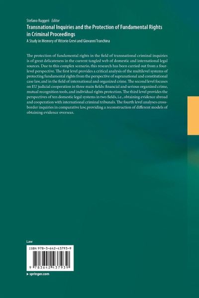The protection of fundamental rights in the field of transnational criminal inquiries is of great delicateness in the current tangled web of domestic and international legal sources. Due to this complex scenario, this research has been carried out from a four-level perspective. The first part provides a critical analysis of the multilevel systems of protecting fundamental rights from the perspective of supranational and constitutional case law, and in the field of international and organized crime. The second part focuses on EU judicial cooperation in three main fields: financial and serious organized crime, mutual recognition tools, and individual rights protection. The third part provides the perspectives of ten domestic legal systems in two fields, i.e., obtaining evidence abroad and cooperation with international criminal tribunals. The fourth part analyses cross-border inquiries in comparative law, providing a reconstruction of different models of obtaining evidence overseas.