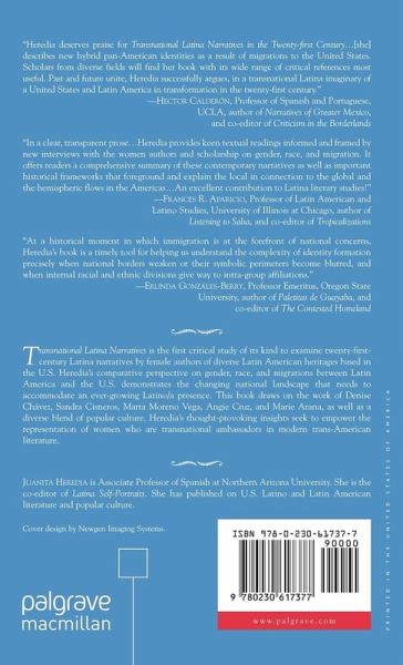 "Heredia deserves praise for Transnational Latina Narratives in the Twenty-First Century. She takes up issues of identity formation in five women writers across borders, seas, and continents, from Chicago, to New York, the U.S.-Mexico border, Mexico City, San Juan, Puerto Rico, Santo Domingo, Dominican Republic, and Lima, Peru. Her readings of Denise Chávez (New Mexico), Sandra Cisneros (Chicago, San Antonio, Mexico), Marta Moreno Vega (New York, Puerto Rico), Angie Cruz (New York, Dominican Republic), and Marie Arana (New York, Peru) are rich in autobiographical and cultural detail. Readers witness personal liberation forged out of long-standing gender, racial, and class determinations. This book is in many ways Latin American literarystudies. Heredia's frame of reference includes film and music of Latin American popular culture, Indigenous and Afro-Caribbean cultural traditions, and the vestiges of Spanish colonialism, slavery, servitude, and caste systems. However, this book is also U.S. literary studies. Heredia describes new hybrid pan-American identities as a result of migrations to the United States. Scholars from diverse fields will find Heredia's book with its wide range of critical references most useful. Past and future unite, Heredia successfully argues, in a transnational Latina imaginary of a United States and Latin America in transformation in the twenty-first century." - Hector Calderon, Professor of Spanish and Portuguese, UCLA, author of Narratives of Greater Mexico, and co-editor of Criticism in the Borderlands