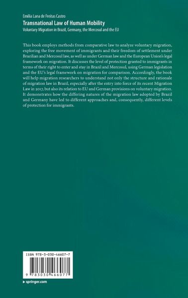 This book employs methods from comparative law to analyze voluntary migration, exploring the free movement of immigrants and their freedom of settlement under Brazilian and Mercosul law, as well as under German law and the European Union's legal framework on migration. It discusses the level of protection granted to immigrants in terms of their right to enter and stay in Brazil and Mercosul, using German legislation and the EU's legal framework on migration for comparison. Accordingly, the book will help migration researchers to understand not only the structure and rationale of migration law in Brazil, especially after the entry into force of its recent Migration Law in 2017, but also its relation to EU and German provisions on voluntary migration. It demonstrates how the differing natures of the migration law adopted by Brazil and Germany have led to different approaches and, consequently, different levels of protection for immigrants.