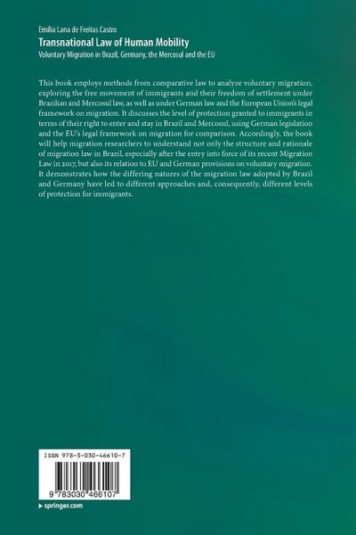 This book employs methods from comparative law to analyze voluntary migration, exploring the free movement of immigrants and their freedom of settlement under Brazilian and Mercosul law, as well as under German law and the European Union's legal framework on migration. It discusses the level of protection granted to immigrants in terms of their right to enter and stay in Brazil and Mercosul, using German legislation and the EU's legal framework on migration for comparison. Accordingly, the book will help migration researchers to understand not only the structure and rationale of migration law in Brazil, especially after the entry into force of its recent Migration Law in 2017, but also its relation to EU and German provisions on voluntary migration. It demonstrates how the differing natures of the migration law adopted by Brazil and Germany have led to different approaches and, consequently, different levels of protection for immigrants.