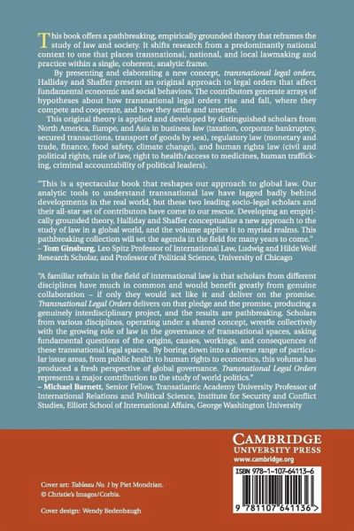 This book offers a path-breaking, empirically grounded theory that reframes the study of law and society. It shifts research from a predominantly national context to one that places transnational, national and local lawmaking and practice within a single, coherent, analytic frame. By presenting and elaborating a new concept, transnational legal orders, Halliday and Shaffer present an original approach to legal orders that affect fundamental economic and social behaviors. The contributors generate arrays of hypotheses about how transnational legal orders rise and fall, where they compete and cooperate, and how they settle and unsettle. This original theory is applied and developed by distinguished scholars from North America, Europe and Asia in business law (taxation, corporate bankruptcy, secured transactions, transport of goods by sea), regulatory law (monetary and trade, finance, food safety, climate change), and human rights law (civil and political rights, rule of law, right to health/access to medicines, human trafficking, criminal accountability of political leaders).