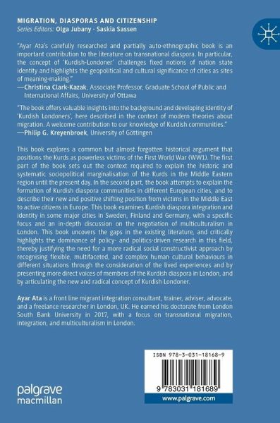 This book explores a common but almost forgotten historical argument that positions the Kurds as powerless victims of the First World War (WW1). To this end, the book looks critically at the unfavourable political situations of the Kurds in the post-WW1 era, which began with the emergence of three new modern nation-states in the Middle East-Turkey, Iraq, and Syria-as well as related modernising events in Iran. It demonstrates the dire consequences of oppressive international and regional state policies against the Kurds, which led to mass displacement and forced migration of the Kurds from the 1920s on. The first part of the book sets out the context required to explain the historic and systematic sociopolitical marginalisation of the Kurds in the Middle Eastern region until the present day. In the second part, the book attempts to explain the formation of Kurdish diaspora communities in different European cities, and to describe their new and positive shifting position from victims inthe Middle East to active citizens in Europe. This book examines Kurdish diaspora integration and identity in some major cities in Sweden, Finland and Germany, with a specific focus and an in-depth discussion on the negotiation of multiculturalism in London. This book uncovers the gaps in the existing literature, and critically highlights the dominance of policy- and politics-driven research in this field, thereby justifying the need for a more radical social constructivist approach by recognising flexible, multifaceted, and complex human cultural behaviours in different situations through the consideration of the lived experiences and by presenting more direct voices of members of the Kurdish diaspora in London, and by articulating the new and radical concept of Kurdish Londoner.