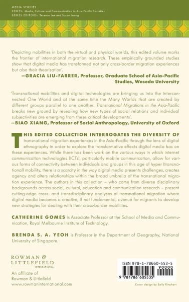 List of Figures / Acknowledgements / Introduction / PART 1. THE NEW CHALLENGES DIGITAL MEDIA CREATES IN UNDERSTANDING THE TRANSNATIONAL MIGRATION EXPERIENCE / 1. Navigating Online Down Under: International Students' Digital Journeys in Australia by Shanton Chang, Catherine Gomes and Fran Martin / 2. Bridging Parental Expectations and Children's Aspirations: Creative Strategies in Migrant Students' Mediated Communication with their Left-behind Families by Becky Pham and Sun Sun Lim / PART 2. NEW FORMS OF AGENCY DIGITAL MEDIA FACILITATES / 3. Chapter 3: Fight Back through Facebook: Retaliating against Local Gossip and Creating New Identities by Monika Winarnita and Nicholas Herriman / 4. Indian Migrants and their Transnational Families: Communication across Time and Borders by Supriya Singh / 5. A Sense of Belonging: Social Media Use of Latin American migrants in Australia by Glenda Mejía, Trinidad Espinosa Abascal and Val Colic-Peisker / PART 3. THE EXPERIENCES OF DIGITAL MEDIA TO ALTER RELATIONSHIPS IN THE T