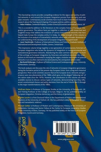 'This impressive volume brings togethera new generation of contemporary historians of European integration who locate the dynamics of integration in transgovernmental and transnational governance networks. Abandoning the state-centrism still present in much of the writings on European integration by historians and political scientists, the contributions to this book are interested in studying the origins, evolution and impact of political networks in an era often claimed to be dominated by the omnipotent nation-state.'