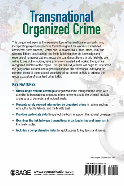 Transnational Organized Crime: An Overview from Six Continents explores the expansive topic of transnational organized crime, incorporating expert perspectives found throughout the world's six inhabited continents: North America, Central and South America, Europe, Africa, Asia, and Oceania. Editors Jay S. Albanese and Philip L. Reichel gather the knowledge and expertise of numerous authors, researchers, and practitioners in this field who are either native to each world region, have extensively travelled and worked there, or are recognized scholars for those regions. Through this unique text, readers will begin to understand the geographic, cultural, and regional similarities and differences underying the common threat of transnational organized crime, as well as how to address the global expansion of organized crime today.