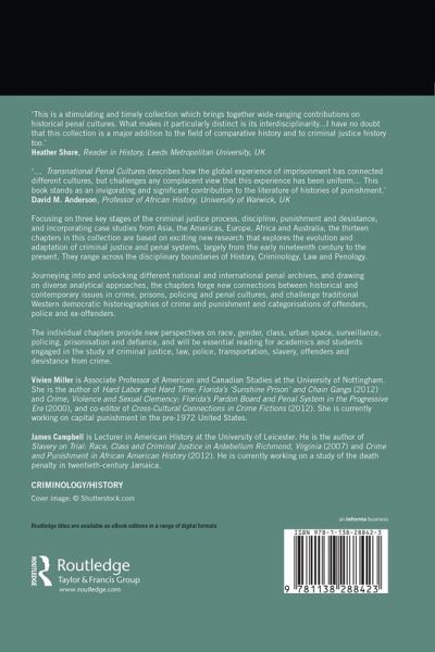Focusing on three key stages of the criminal justice process, discipline, punishment and desistance, and incorporating case studies from Asia, the Americas, Europe, Africa and Australia, the thirteen chapters in this collection are based on exciting new research that explores the evolution and adaptation of criminal justice and penal systems, largely from the early nineteenth century to the present. They range across the disciplinary boundaries of History, Criminology, Law and Penology. Journeying into and unlocking different national and international penal archives, and drawing on diverse analytical approaches, the chapters forge new connections between historical and contemporary issues in crime, prisons, policing and penal cultures, and challenge traditional Western democratic historiographies of crime and punishment and categorisations of offenders, police and ex-offenders. The individual chapters provide new perspectives on race, gender, class, urban space, surveillance, policing, prisonisation and defiance, and will be essential reading for academics and students engaged in the study of criminal justice, law, police, transportation, slavery, offenders and desistance from crime.