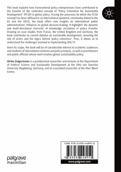 This book explains how transnational policy entrepreneurs have contributed to the transfer of the contested concept of 'Policy Coherence for Sustainable Development' (PCSD) in global policy. Tracing the processes by which the PCSD concept has been diffused in an international epistemic community linked to the EU and the OECD, the book offers new insights on international public administrations' influence on global decision-making. It highlights the dynamic and multi-directional character of knowledge circulation in policy transfer. Drawing on case studies from France, the United Kingdom and Germany, the book contributes to current debates on sustainable development, revealing the role of actors and the logics behind 'policy coherence'. Thus, it allows to understand the challenges involved in implementing SDG 17. Given its scope, the book will be of considerable interest to academic audiences and students of international relations and policy analysis, as well as practitioners andpublic officials whose work involves global sustainability policy.