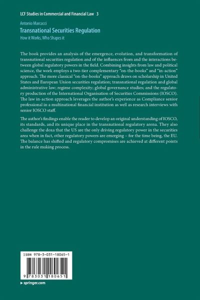 The book provides an analysis of the emergence, evolution, and transformation of transnational securities regulation and of the influences from and the interactions between global regulatory powers in the field. Combining insights from law and political science, the work employs a two-tier complementary "on-the-books" and "in-action" approach. The more classical "on-the-books" approach draws on scholarship in United States and European Union securities regulation; transnational regulation and global administrative law; regime complexity; global governance studies; and the regulatory production of the International Organisation of Securities Commissions (IOSCO). The law in-action approach leverages the author's experience as Compliance senior professional in a multinational financial institution as well as research interviews with senior IOSCO staff. The author's findings enable the reader to develop an original understanding of IOSCO, its standards, and its unique place in thetransnational regulatory arena. They also challenge the doxa that the US are the only driving regulatory power in the securities area when in fact, other regulatory powers are emerging - for the time being, the EU. The balance has shifted and regulatory compromises are achieved at different points in the rule making process.