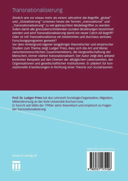 Vor dem Hintergrund eigener langjähriger theoretischer und empirischer Studien zum Thema zeigt Ludger Pries, dass sich die Art und Weise zwischenmenschlichen Zusammenlebens, die Vergesellschaftung der Menschen, immer stärker transnationalisiert. Damit ist Transnationalisierung eine wichtige Form der Internationalisierung von Vergesellschaftung, die unser 21. Jahrhundert sehr stark bestimmen wird. Der Autor zeigt dies anhand konkreter Beispiele auf den Ebenen der alltäglichen Lebenswelten, der Organisationen und gesellschaftlicher Institutionen.