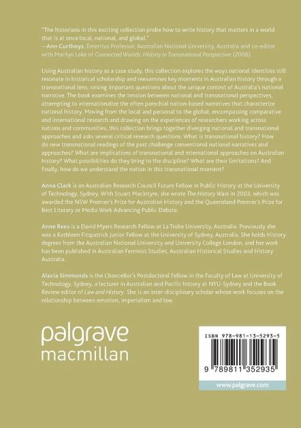 Testing the Boundaries: Reflections on Transnationalism in Australian History.- Section I Crossing Borders: New Transnational Histories.- A Tale of Two Rivers: The Cooks River and the Los Angeles River in Transnational and Comparative Perspective.- Australia's Black History: The Politics of Comparison and Transnational Indigenous Activism in Commonwealth Settler States.- Rebel Handmaidens: Transpacific Histories and the Limits of Transnationalism.- Transnationalism and the Writing of Australian Women's History.- Section II National Histories in an Age of Transnationalism.- Is Australian History Over-determined by the Transnational Turn?.- Australia's 1980s in Transnational Perspective.- Subjects and Readers: National and Transnational Contexts.- Reading Postwar Reconstruction Through National and Transnational Lenses.- Section III Intimacy and Transnationalism: Reading Vernacular Histories.- Thinking Transnationally about Sexuality: Homosexuality in Australia or Australian Homosexualities?.- Family History and Transnational Historical Consciousness.- Intimate Jurisdictions: Reflections upon the Relationship Between Sentiment, Law and Empire.