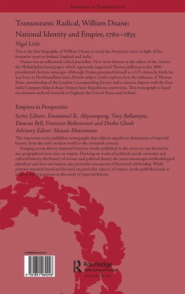 William Duane is most famous as the editor of "The Aurora", the Philadelphia-based paper which vigorously supported Thomas Jefferson in his 1800 presidential election campaign. Based on archival research, this biography of Duane studies his American career in light of his formative years in Ireland, England and India.