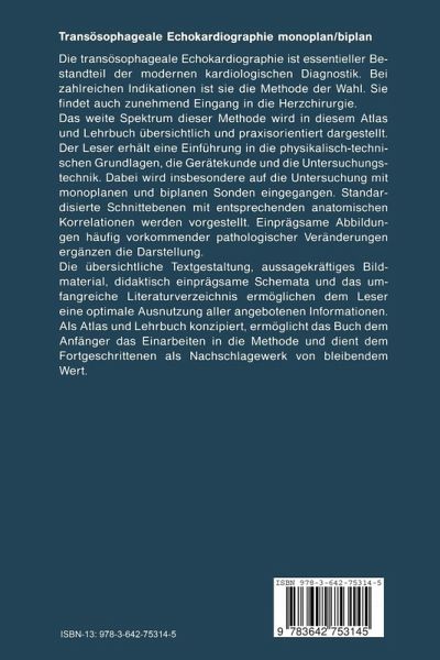 Das Buch erm glicht dem Leser sich in die trans sophageale Echokardiographieeinzuarbeiten. Untersuchungsablauf und Schnittebenen mit anatomischen Korrelationen werden standar- disiert f}r mono- und bi-plane TEE-Sonden vorgestellt. Alle h{ufigen pathologischen Befunde werden abgebildet. Einpr{g- same klare Graphiken erleichtern das Verst{ndnis.