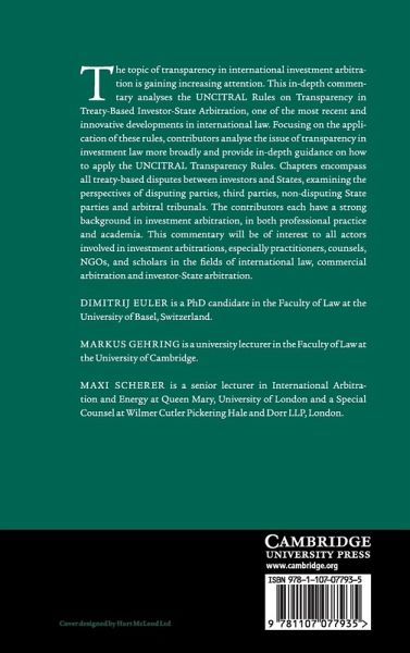 The topic of transparency in international investment arbitration is gaining increasing attention. This in-depth commentary analyses the UNCITRAL Rules on Transparency in Treaty-Based Investor-State Arbitration, one of the most recent and innovative developments in international law. Focusing on the application of these rules, contributors analyse the issue of transparency in investment law more broadly and provide in-depth guidance on how to apply the UNCITRAL transparency rules. Chapters encompass all treaty-based disputes between investors and state, examining the perspectives of disputing parties, third parties, non-disputing state parties and arbitral tribunals. The contributors each have a strong background in investment arbitration, in both professional practice and academia. This commentary will be of interest to all actors involved in investment arbitrations, especially practitioners, counsels, NGOs and scholars in the fields of international law, commercial arbitration and investor-state arbitration.
