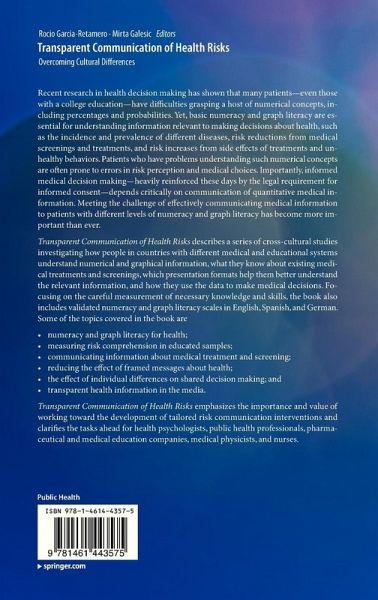 Transparent Communication of Health Risks emphasizes the importance and value of working toward the development of tailored risk communication interventions and clarifies the tasks ahead for health psychologists, public health professionals, pharmaceutical and medical education companies, medical physicists, and nurses.