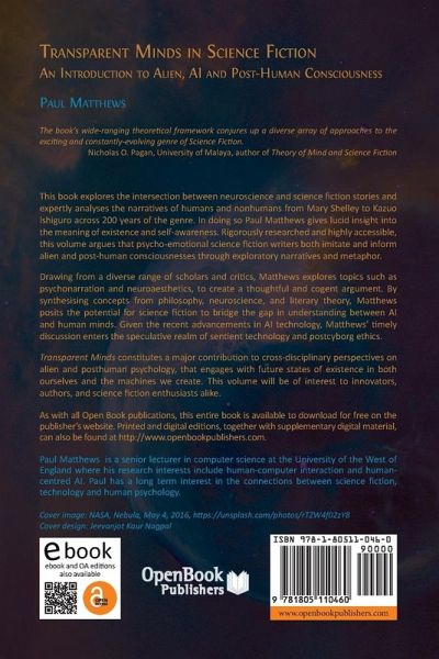 Transparent Minds explores the intersection between neuroscience and science fiction stories. Paul Matthews expertly analyses the narratives of humans and nonhumans from Mary Shelley to Kazuo Ishiguro across 200 years of the genre. In doing so he gives lucid insight into the meaning of existence and self-awareness. Rigorously researched and highly accessible, Matthews argues that psycho-emotional science fiction writers both imitate and inform alien and post-human consciousnesses through exploratory narratives and metaphor. Drawing from a diverse range of scholars and critics, Matthews explores topics such as psychonarration and neuroaesthetics, to create a thoughtful and cogent argument. By synthesising concepts from philosophy, neuroscience, and literary theory, Matthews posits the potential for science fiction to bridge the gap in understanding between AI and human minds. Given the recent advancements in AI technology, Matthews' timely discussion enters the speculative realm of sentient technology and postcyborg ethics. The work constitutes a major contribution to cross-disciplinary perspectives on alien and posthuman psychology, that engages with future states of existence in both ourselves and the machines we create. Transparent Minds will be of interest to innovators, authors, and science fiction enthusiasts alike.