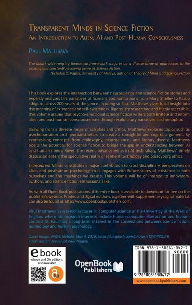 Transparent Minds explores the intersection between neuroscience and science fiction stories. Paul Matthews expertly analyses the narratives of humans and nonhumans from Mary Shelley to Kazuo Ishiguro across 200 years of the genre. In doing so he gives lucid insight into the meaning of existence and self-awareness. Rigorously researched and highly accessible, Matthews argues that psycho-emotional science fiction writers both imitate and inform alien and post-human consciousnesses through exploratory narratives and metaphor. Drawing from a diverse range of scholars and critics, Matthews explores topics such as psychonarration and neuroaesthetics, to create a thoughtful and cogent argument. By synthesising concepts from philosophy, neuroscience, and literary theory, Matthews posits the potential for science fiction to bridge the gap in understanding between AI and human minds. Given the recent advancements in AI technology, Matthews' timely discussion enters the speculative realm of sentient technology and postcyborg ethics. The work constitutes a major contribution to cross-disciplinary perspectives on alien and posthuman psychology, that engages with future states of existence in both ourselves and the machines we create. Transparent Minds will be of interest to innovators, authors, and science fiction enthusiasts alike.