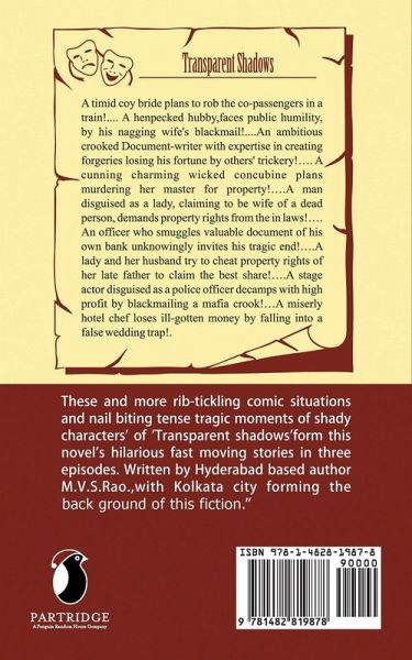 ?Transparent Shadows? is a work of fiction, created stories around two amateur professional actors, who were very popular stage artists, of Kolkata. In spite long experience enacting various roles Shoilen Dutta, finds that he could not get absorbed due to severe compition, in real acting careers to get lucrative chances in professional stage, TV serials or film opportunities in Kolkata, . As he was getting past middle age with meager income, he realizes the bleak future awaits him; as he may have to quit the profession and depend on others, if he becomes invalid or old!. He, along with another a younger amateur stage artist Lolit Sen, decide to earn illicitly by exploiting many foolish public by deception with their clever acting profession!. They make elaborate planning in acts of deceit of different situations to make money from unsuspecting victims. Their new ventures are depicted in Three Episodes of this book. In each episode the duos face variety of characters with different situations having interesting twists and unexpected turns, with a touch of humour!. It is in fact compilation of different stories in which the two play interesting key roles,of this Crime novel with three hilarious Episodes. This is a fiction and not based on real lives of any past or present stage actors.