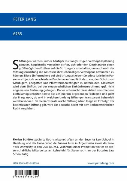 Stiftungen werden immer häufiger zur langfristigen Vermögensplanung genutzt. Regelmäßig versuchen Stifter, sich oder den Destinatären einen größtmöglichen Einfluss auf die Stiftung vorzubehalten, um auch nach der Stiftungserrichtung die Geschicke ihres ehemaligen Vermögens bestimmen zu können. Diese Einflussnahme auf die Stiftung als eigentümerlose juristische Person wirft jedoch verschiedene Probleme auf und lädt dazu ein, den Schutz von Gläubigern, Ehegatten und Pflichtteilsberechtigten zu unterlaufen. Gleichsam wird dem Einfluss bei der steuerrechtlichen Einkünftezurechnung ggf. nicht angemessen Rechnung getragen. Daher untersucht diese Arbeit verschiedene Einflussmöglichkeiten sowie die sich hieraus ergebenden Probleme und geht der Frage nach, ob und in welchem Umfang Stiftungen transparent behandelt werden können. Da die liechtensteinische Stiftung schon lange als Prototyp der beeinflussten Stiftung gilt, wird das deutsche Recht mit dem liechtensteinischen Recht verglichen.