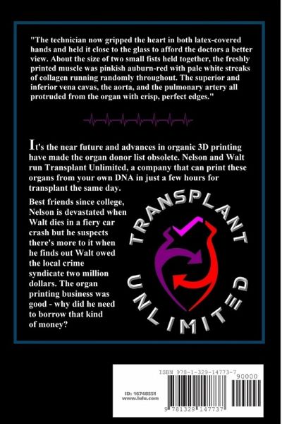 It's the near future and advances in organic 3D printing have made the organ donor list obsolete. Nelson and Walt run Transplant Unlimited, a company that can print these organs from your own DNA in just a few hours for transplant the same day. Best friends since college, Nelson is devastated when Walt dies in a fiery car crash but he suspects there's more to it when he finds out Walt owed the local crime syndicate two million dollars. The organ printing business was good - why did he need to borrow that kind of money?