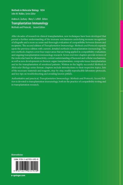 "The purpose is to provide an overview of key areas of research in transplant immunology and detailed descriptions of relevant methodology. An appropriate audience includes solid organ transplant physicians, immunologists, and immunology laboratory staff. ... I find this book very useful. It covers important topics in transplant immunology in great detail, and is a wonderful opportunity to review the current understanding of important topics by leaders in the field." (Christina Klein, Doody's Book Reviews, November, 2013)