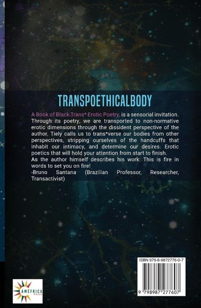 A Book of Black Trans* Erotic Poetry, is a sensorial invitation. Through its poetry, we are transported to non-normative erotic dimensions through the dissident perspective of the author. Tiely calls us to trans*verse our bodies from other perspectives, stripping ourselves of the handcuffs that inhabit our intimacy, and determine our desires. Erotic poetics that will hold your attention from start to finish. As the author himself describes his work: This is fire in words to set you on fire! -Bruno Santana (Brazilian Professor, Researcher, Transactivist)