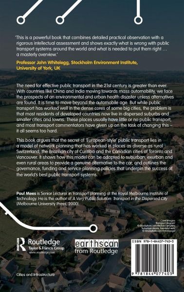 The need for effective public transport is greater than ever in the twenty-first century. With countries like China and India moving towards mass-automobility, we face the prospects of an environmental and urban health disaster unless alternatives are found. It is time to move beyond the automobile age. But while public transport has worked well in the dense cores of some big cities, the problem is that most residents of developed countries now live in dispersed suburbs and smaller cities and towns. These places usually have little or no public transport, and most transport commentators have given up on the task of changing this: it all seems too hard. Transport for Surburbia argues that the secret of 'European-style' public transport lies in a generalizable model of network planning that has worked in places as diverse as rural Switzerland, the Brazilian city of Curitiba and the Canadian cities of Toronto and Vancouver. It shows how this model can be adapted to suburban, exurban and even rural areas to provide a genuine alternative to the car, and outlines the governance, funding and service planning policies that underpin the success of the world's best public transport systems.