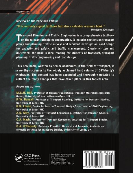 'Transport Planning and Traffic Engineering' is a comprehensive textbook on the relevant principles and practice. It includes sections on transport policy and planning, traffic surveys and accident investigation, road design for capacity and safety, and traffic management. Clearly written and illustrated, the book is ideal reading for students of transport, transport planning, traffic engineering and road design. This new book, written by senior academics in the field of transport, is a worthy successor to the widely acclaimed first volume of O'Flaherty's Highways. The content has been expanded and thoroughly updated to reflect the many changes that have taken place in this topical area.