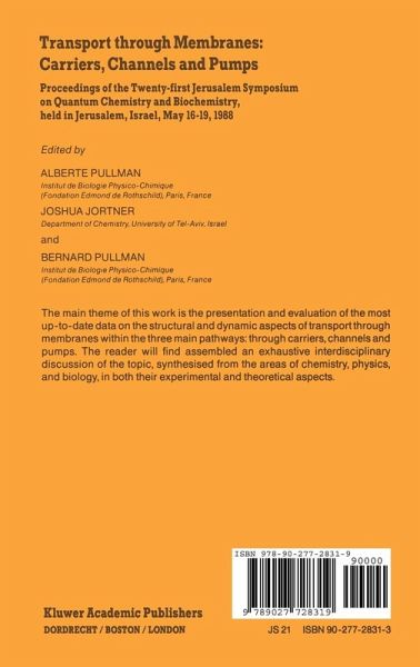 The Symposium on "Transport through Membranes : Carriers. Channels and Pumps" Inaugurates the third decade of the Jerusalem Symposia. It enlarges substantially their conceptual scope by Introducing a new subject not treated there previously. In fact. It Is a topic particularly well suited for the general object of these International meetings which Is to reassemble In an exhaustive Interdisciplinary discussion chemists. physicists and biologists. theoreticians and experimentalists. The main theme of the Symposium was the presentation and evaluation of the most up-to-date data on the structural and dynamic aspects of transport through membranes within the three main pathways: through carriers. channels and pumps. This goal was fully achieved thanks to the participation of a most outstanding assembly of world's experts In the field. We wish to thank Madame Pullman. the real organizer and mainspring of this meeting. for having composed a most exciting and excellent program and for carrying It out successfully. As the twenty preceding ones this Symposium was held under the auspices of the Israel Academy of Sciences and Humanities and the Hebrew University of Jerusalem. It was sponsored by the Instltut de Blologle Physlco Chimique. Fondatlon Edmond de Rothschild of Paris. We wish to express once again our gratitude to the Baron Edmond de Rothschild for his constant and generous support which makes this continuous endeavour possible.