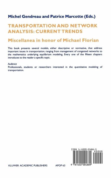 MICHEL GENDREAU AND PATRICE MARCOTTE As an academic, Michael Florian has always stood at the forefront of transportation research. This is reflected in the miscellaneous contributions that make the chapters of this book, which are related in some way or another to Michael's interests in both the theoretical and practical aspects of his field. These interests span the areas of Traffic Assignment, Network Equilibrium, Shortest Paths, Railroad problems, De mand models, Variational Inequalities, Intelligent Transportation Systems, etc. The contributions are briefly outlined below. BASSANINI, LA BELLA AND NASTASI determine a track pricing policy for railroad companies through the solution of a generalized Nash game. BEN-AKIVA, BIER LAIRE, KOUTSOPOULOS AND MISHALANI discuss simulation-based estimators of the interactions between supply and demand within a real-time transportation system. BOYCE, BALASUBRAMANIAM AND TIAN analyze the impact of marginal cost pricing on urban traffic in theChicago region. BROTCORNE, DE WOLF, GENDREAU AND LABBE present a discrete model of dynamic traffic assignment where flow departure is endogenous and the First-In-First-Out condition is strictly enforced. CASCETTA AND IMP ROTA give a rigorous treatment of the problem of estimating travel demand from observed data, both in the static and dynamic cases. CRAINIC, DUFOUR, FLo RIAN AND LARIN show how to obtain path information that is consistent with the link information provided by a nonlinear multimodal model. ERLANDER derives the logit model from an efficiency principle rather than from the classical random utility approach.