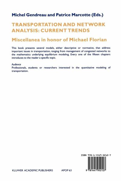 MICHEL GENDREAU AND PATRICE MARCOTTE As an academic, Michael Florian has always stood at the forefront of transportation research. This is reflected in the miscellaneous contributions that make the chapters of this book, which are related in some way or another to Michael's interests in both the theoretical and practical aspects of his field. These interests span the areas of Traffic Assignment, Network Equilibrium, Shortest Paths, Railroad problems, De mand models, Variational Inequalities, Intelligent Transportation Systems, etc. The contributions are briefly outlined below. BASSANINI, LA BELLA AND NASTASI determine a track pricing policy for railroad companies through the solution of a generalized Nash game. BEN-AKIVA, BIER LAIRE, KOUTSOPOULOS AND MISHALANI discuss simulation-based estimators of the interactions between supply and demand within a real-time transportation system. BOYCE, BALASUBRAMANIAM AND TIAN analyze the impact of marginal cost pricing on urban traffic in theChicago region. BROTCORNE, DE WOLF, GENDREAU AND LABBE present a discrete model of dynamic traffic assignment where flow departure is endogenous and the First-In-First-Out condition is strictly enforced. CASCETTA AND IMP ROTA give a rigorous treatment of the problem of estimating travel demand from observed data, both in the static and dynamic cases. CRAINIC, DUFOUR, FLo RIAN AND LARIN show how to obtain path information that is consistent with the link information provided by a nonlinear multimodal model. ERLANDER derives the logit model from an efficiency principle rather than from the classical random utility approach.