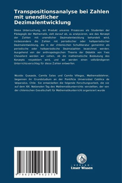 Diese Untersuchung, ein Produkt unseres Prozesses als Studenten der Pädagogik der Mathematik, zielt darauf ab, zu analysieren, wie das Konzept der Zahlen mit unendlicher Dezimalentwicklung behandelt wird, insbesondere die Zahlen mit periodischer oder halbperiodischer Dezimalentwicklung, die in der chilenischen Schulliteratur gemeinhin als periodische oder halbperiodische Dezimalzahlen bezeichnet werden. Ausgehend von der anthropologischen Theorie der Didaktik von Yves Chevallard werden wir sehen, ob die mathematische Bedeutung des Konzepts respektiert wird, und wir werden einen vollständigeren Unterrichtsvorschlag für diese Zahlen entwerfen.
