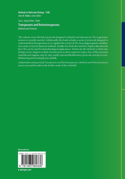 This volume covers the latest protocols designed to identify and characterize TEs in genomes, ancient or recently inserted. Additionally, this book includes a series of protocols designed to understand how host genomes act to regulate the activity of TEs, from elegant genetic mobilization assays to key biochemical methods. Finally, this book also includes chapters that describe how TEs can be used for biotechnological applications. Written for the Methods in Molecular Biology series, chapters include introductions to their respective topics, lists of the necessary materials and reagents, step-by-step, readily reproducible laboratory protocols, and tips on troubleshooting and avoiding known pitfalls.